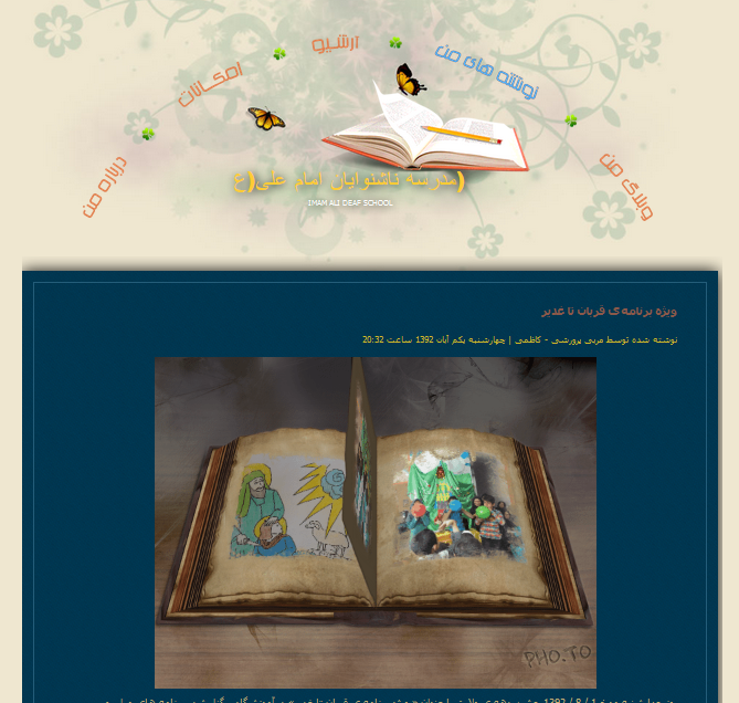 روز چهارشنبه مورخ 1 / 8 / 1392 جشن دهه ی ولایت با عنوان « ویژه برنامه ی قربان تا غدیر» در آموزشگاه برگزار شد. برنامه های مراسم شامل نمایشگاه نقاشی ، تلاوت قرآن و سرود جمهوری اسلامی ایران و اجرای گروه سرود ناشنوایان ، برگزاری مسابقه ویژه معلمان و اهدای جوایز به 3 نفر برتر مسابقه ، برگزاری مسابقه ی بادکردن بادکنک توسط دانش آموزان و اهدای جوایز به برندگان مسابقه ، اهدای جوایز به دانش آموزان باحجاب آموزشگاه ، بازگویی داستان غدیر و توزیع کارت آموزه های عید غدیر توسط همکاران، معرفی کتب مذهبی مصور ویژه ی کودکان و تشویق دانش آموزان به استفاده از کتابخانه ی مدرسه، اهدای جوایز به سادات و در پایان پذیرایی از دانش آموزان